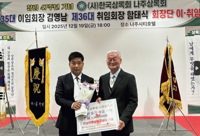 이번 기탁은 제35대 김영남 회장 이임식과 제36대 함태식 회장 취임식에 맞춰 진행됐으며 나주상록회가 지역사회와 함께하는 나눔의 의미를 되새기는 뜻깊은 자리로 마련됐다.
