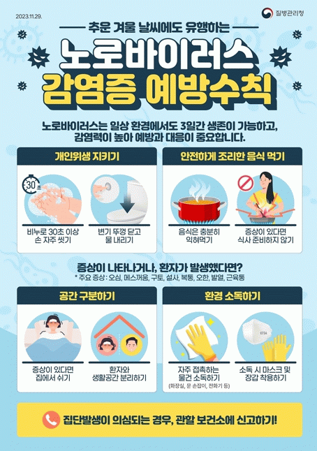 강용곤 보건소장은 “노로바이러스는 예방 백신이 없어 개인위생 관리가 무엇보다 중요하다”며 “특히 영유아 가정과 학교, 어린이집 등 집단시설에서는 손 씻기와 환경 소독 등 위생 관리에 각별히 유의해 주시길 바란다”고 말했다.