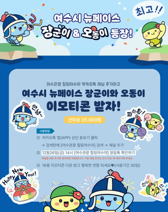 시 관계자는 “새롭게 리뉴얼된 마스코트 이모티콘이 시민 일상 속에서 자연스럽게 활용되며 여수시에 대한 친밀감을 높이는 계기가 되길 바란다”며 “앞으로도 마스코트를 활용한 다양한 홍보 콘텐츠를 통해 시민과의 소통을 더욱 강화해 나가겠다”고 말했다.