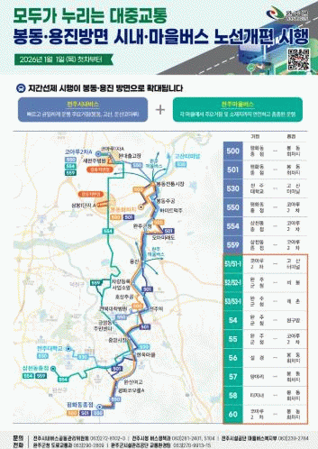 유희태 완주군수는 “봉동·용진 지역에 마을버스가 본격 도입되면서 친절도 향상과 맞춤형 시간표 운영, 정시성 확보, 교통비 절감 등 다양한 긍정적 효과가 나타날 것”이라며, “앞으로도 군민들의 대중교통 이용 편의를 높이기 위해 지속적으로 개선해 나가겠다”고 말했다.