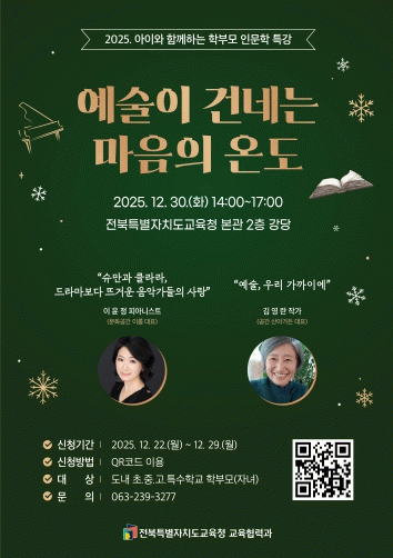 임경진 교육협력과장은 “이번 특강은 2025년도 마지막 학부모교육으로 자녀와 학부모가 음악과 미술을 매개로 소통하며 예술적 영감을 나누는 자리”라며 “공감·창의·감정·사고력을 아우르는 예술적 감각을 키우고, 앞으로도 학부모와 자녀가 함께 소통할 수 있는 학부모교육 프로그램을 지속적으로 운영해 나가겠다”고 말했다.