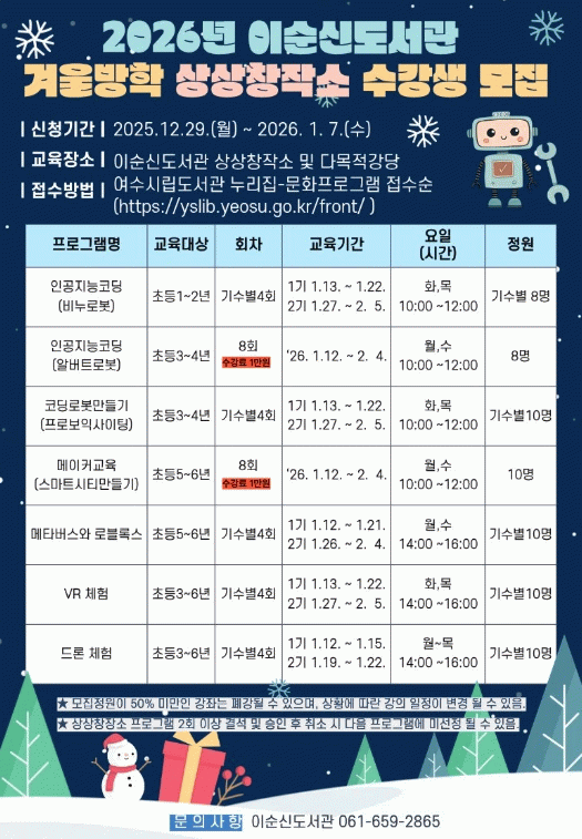 이번 프로그램은 관내 초등학생을 대상으로 하는 7개 강좌로 구성되며, 2026년 1월 12일부터 2월 5일까지 운영된다.