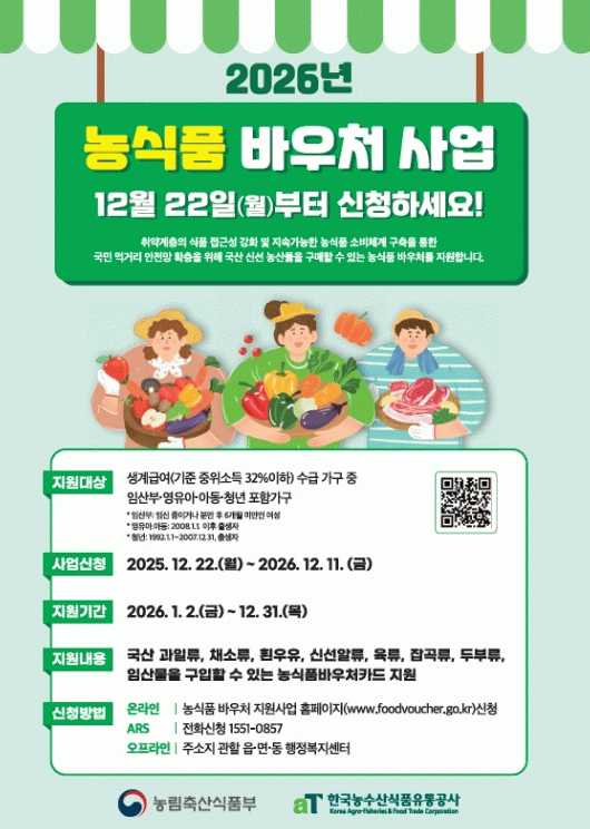 시 관계자는 “2026년에는 청년층까지 지원 대상을 확대해 더 많은 가구가 혜택을 받을 수 있도록 사업을 했다”며 “농식품 바우처가 저소득층의 건강한 식생활을 돕고 지역 농산물 소비 촉진을 통해 지역경제에도 긍정적인 효과를 가져올 것으로 기대한다”고 말했다.