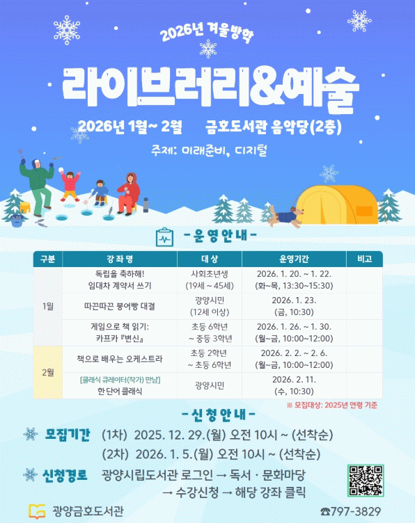 프로그램 신청은 강좌별 모집 일정에 따라 12월 29일 오전 10시부터 선착순으로 진행되며, 자세한 사항은 광양시립도서관 누리집을 확인하거나 금호도서관으로 문의하면 안내받을 수 있다.
