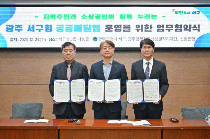 서구는 광주경제진흥상생일자리재단, ㈜신한은행 땡겨요 사업단과 ‘서구형 공공배달앱 운영을 위한 업무협약’을 체결하고, 온라인 배달 소비 영역까지 골목경제 회복 정책을 확대한다고 밝혔다.