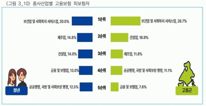 일자리 관련 통계 결과를 보면, ‘2024년 하반기 기준 청년 고용률은 81%로 나타났으며, 주요 종사산업은 보건 및 사회복지서비스업이 20%로 가장 높았다.