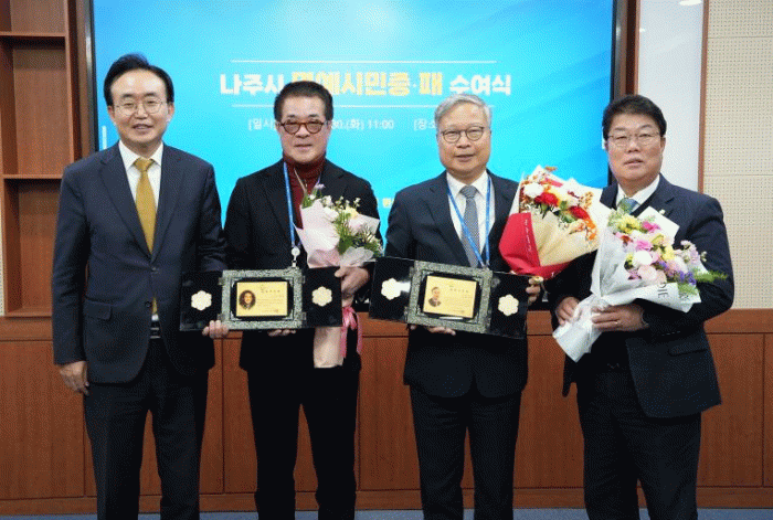 나주시는 30일 시청 이화실에서 ‘명예시민증·패’ 수여식을 열고 윤의준 한국공학한림원 회장과 박명성 주식회사 신시컴퍼니 예술감독에 명예시민증과 명예시민패를 각각 수여했다고 밝혔다.