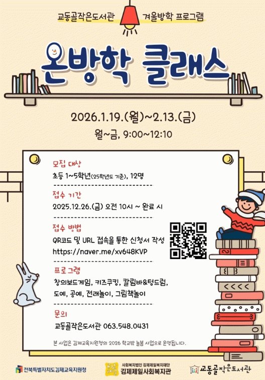 교동골작은도서관 관계자는“아이들의 겨울방학을 보다 알차고 따뜻하게 채워줄 이번 프로그램에 많은 관심과 참여를 바란다”고 전했다.