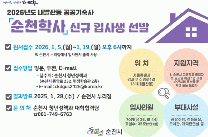 순천학사 입사서류는 순천시 청년정책과 방문, 등기우편 또는 이메일을 통해 오는 19일 오후 6시까지 제출해야 하며 최종합격자는 28일에 발표할 예정이다.