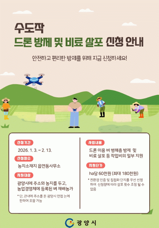 신청 대상은 광양시에 주소와 농지를 두고 벼를 재배하는 농업경영체로, 신청 기간은 2026년 1월 5일부터 2월 13일까지이며 지원을 희망하는 농업인은 기간 내 농지소재지 읍·면·동사무소에서 신청하면 된다.