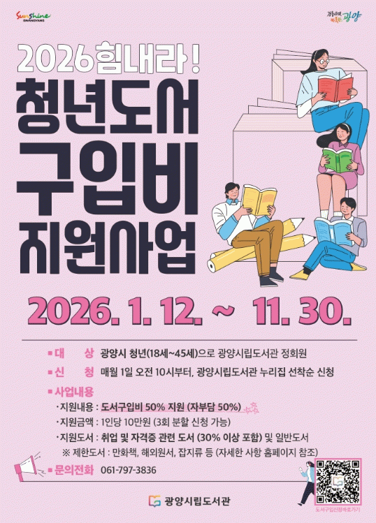 지원 대상은 광양시에 거주하는 18세부터 45세까지의 청년으로, 1인당 최대 10만 원 한도 내에서 도서구입비의 50%(자부담 50%)를 지원한다.