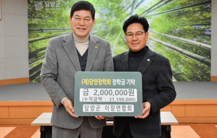 담양군 12개 읍·면 이장들로 구성된 담양군 이장연합회는 지역사회와 상생하는 나눔을 실천하고자 지난 2009년부터 현재까지 3,100만 원의 장학금을 꾸준히 기탁해 오고 있으며, 올해도 새해의 시작과 함께 담양군의 발전과 미래 인재 양성을 기원하는 마음을 한데 모아 장학금을 마련했다.