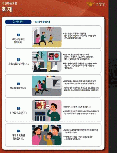화재예방을 위해서는 세대별로 잘 보이는 곳에 소화기를 비치하고, 음식물 조리 중에는 외출이나 자리를 비우지 않아야 한다.