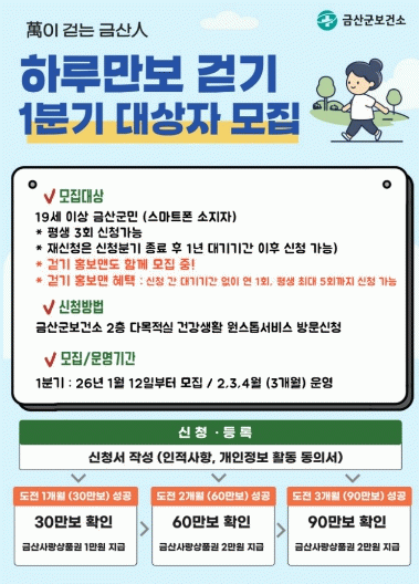 금산군보건소 관계자는 “하루만보 걷기는 누구나 쉽게 참여할 수 있는 건강증진 프로그램”이라며 “많은 관심과 참여를 바란다”고 말했다.