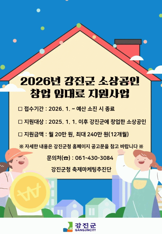 지원 대상은 2025년 1월 1일 이후 강진군에 사업자등록과 주민등록 주소를 두고 창업한 소상공인 중, 창업 후 3개월 이상 임대료를 납부하고 있는 이들이다. 지원금은 월 최대 20만 원씩, 최장 12개월 동안 총 240만 원까지 지급된다.
