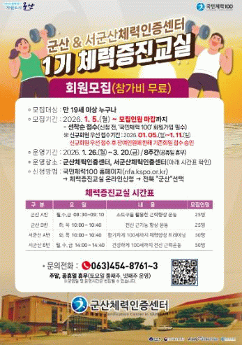 접수는 '국민체력100' 누리집에서 체력증진교실 온라인 신청 메뉴를 찾아 전북 ‘군산’을 선택해서 진행하거나 홍보물의 정보인식부호(QR코드)를 이용하면 된다.