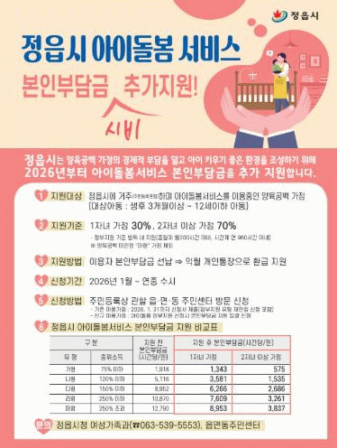 기타 자세한 사항은 정읍시청 여성가족과 또는 각 읍면동 주민센터로 문의하면 안내받을 수 있다.