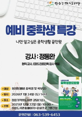 정읍기적의도서관은 오는 24일 토요일 오후 2시, 올해 중학교로 진학하는 학생 대상으로 특별 강연을 운영한다고 8일 밝혔다.