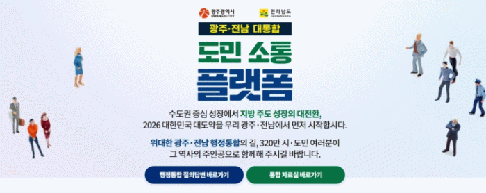 김영록 전남도지사는 “광주·전남 행정통합은 호남의 운명을 바꿀 중요한 사안인 만큼 도민 한 분 한 분의 목소리를 폭넓게 듣는 것이 무엇보다 중요하다”며 “플랫폼을 도민 참여를 기반으로 한 공감대 형성의 중심 창구로 운영하고, 앞으로 열릴 주민설명회에서도 도민의 목소리를 귀담아 듣도록 하겠다”고 말했다.