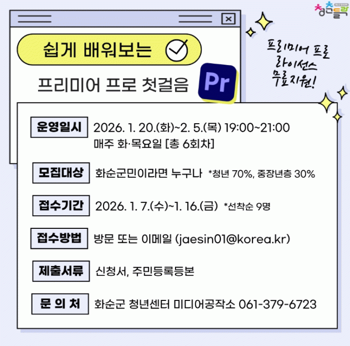 조미화 인구청년정책과장은 “활용도가 높은 프리미어 프로 교육을 통해 영상 편집 역량을 높이는 계기가 되길 바란다”라며, 앞으로도 군민 누구나 부담 없이 참여할 수 있는 미디어 교육 프로그램을 지속적으로 운영해 나가겠다.” 말했다.