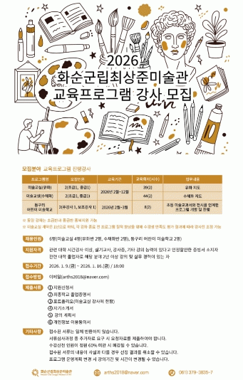 강사 선정은 선정위원회에서 심사 후 개별 통보할 계획이며 강사로 선정되면 2026년 2월부터 12월까지 각 프로그램 일정에 맞게 수업을 지도하게 된다.