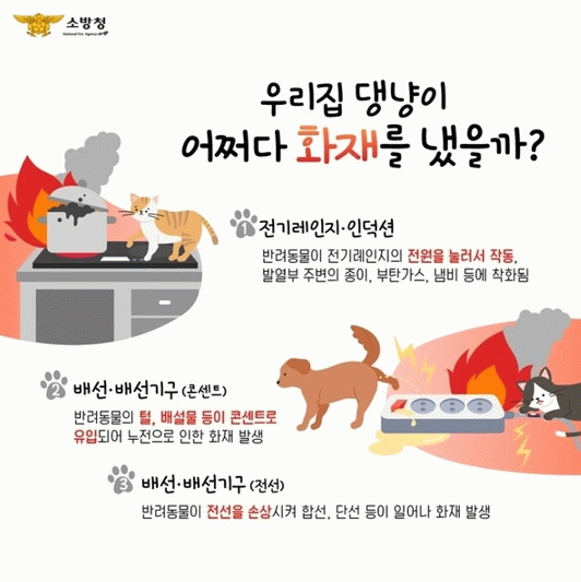 실제로 반려동물이 전기레인지·인덕션 등의 전원버튼을 건드리거나 전선을 물어뜯어 합선·단선 등이 생겨 발생하는 화재 사례가 꾸준히 보고되고 있어 각별한 주의가 필요하다.