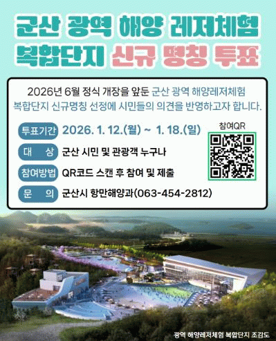 군산시 관계자는 “군산 광역 해양레저체험 복합단지는 시민을 위한 공공시설인 만큼, 명칭 선정 과정에서도 시민의 의견을 폭넓게 반영하고자 한다.”라며 “시민 참여 선호도 조사 40%, 심사위원 평가 60%의 혼합형 심사 방식을 통해 공정성과 전문성을 함께 확보한 만큼, 많은 시민의 적극적인 참여를 기대한다.”라고 밝혔다.