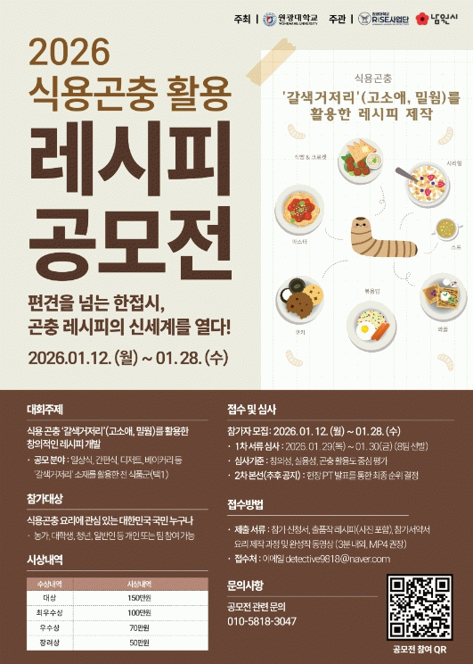 남원시 관계자는 “곤충 식품에 대한 소비자 인식을 개선하고 곤충 단백질의 효능과 가치를 친숙하게 하여 곤충 식품에 대한 국민 정서상 거리를 좁히고, 곤충 식품의 이미지 전환을 위해 【2026 식용 곤충 활용 레시피 공모전】을 추진하게 됐다.”고 말했으며, “식품으로서의 곤충 원료를 대량 생산하기 위해 남원시는 2024년부터 곤충산업 거점 단지 조성 사업을 추진해 곤충산업을 바이오산업 핵심 기반으로 고도화하고 있으며, 전문가들과 협업해 곤충의 가치를 높이고 활용 범위를 넓혀가는 추세로 곤충산업에 대한 많은 관심과 응원 부탁드린다“라고 말했다.