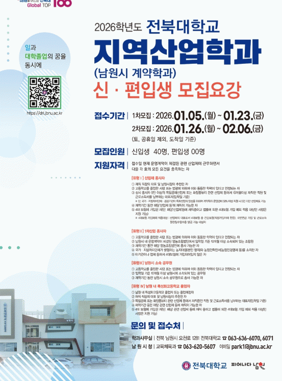 남원시 관계자는 “전북대학교 지역산업학과는 단순한 학위 과정이 아니라 지역산업 활성화와 인재 정착을 위한 핵심 사업”이라며 “입학요건 완화와 도비 확보를 계기로 더 많은 시민과 청년이 전문 역량을 키우고 지역 산업의 경쟁력을 높일 수 있기를 기대한다”고 밝혔다.