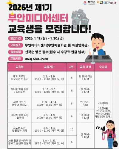 교육 접수는 오는 19일부터 30일까지 진행되며 부안미디어센터 방문을 통해 선착순으로 신청할 수 있다.