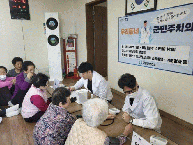 군민주치의는 교통 불편 등 의료기관 접근성이 낮은 마을 경로당을 우선순위로 찾아가 기초 의료서비스를 제공하고, 건강생활 실천 및 질병 예방 교육도 진행하는 민선 8기 영암군의 대표 건강 정책.