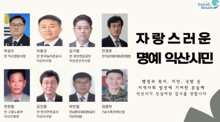이번에 명예시민으로 선정된 이들을 행정, 치안, 복지, 국방 등 다양한 분야에서 익산시와 긴밀히 협력하며 지역사회 발전에 기여한 인물들이다.