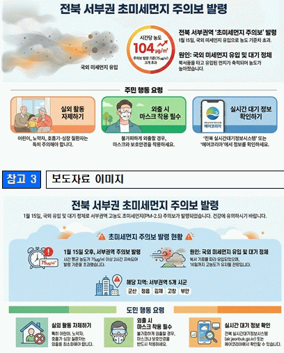 아울러“전북특별자치도 실시간대기정보시스템을 통해 대기환경정보 확인과 예․경보 상황을 알림톡 등으로 받아볼 수 있으니 도민 여러분의 많은 이용을 요청드린다”고 말했다.
