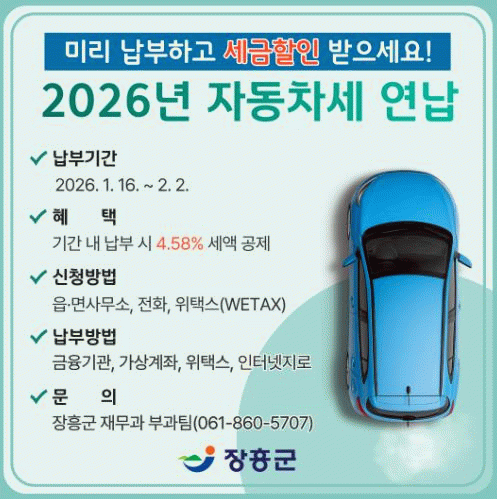 장흥군 관계자는 “고지서를 받으신 군민들은 납부 기한 내에 꼭 연납을 완료해 세금 절감 혜택을 누리시기 바란다”고 말했다.