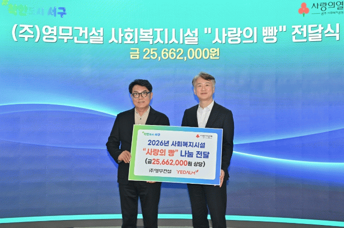 김이강 서구청장은 “정기적인 후원을 통해 따뜻한 나눔을 실천해 주신 ㈜영무건설에 깊이 감사드린다”며 “민관이 함께하는 이러한 나눔이 지역 복지안전망을 더욱 촘촘하고 단단하게 만드는 큰 힘이 될 것이다”고 전했다.