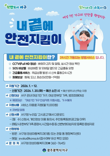 김민정 양성아동복지과장은 “안전지킴이 사업은 범죄에 대한 불안감을 낮추고 일상 속 심리적 안정감을 높여주는 실효성 있는 정책”이라며 “올해도 세밀하고 지속적인 주거안전 지원을 통해 안전 사각지대 없는 서구를 만들겠다”고 말했다.