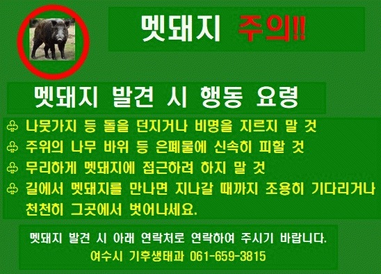 여수시는 멧돼지 피해 예방을 위해 유해야생동물 피해방지단을 선발 및 운영하고 있으며 출몰 우려 지역을 중심으로 피해방지단의 순찰을 강화하고 있다.