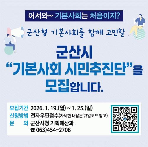 이길용 기획행정국장은 “기본사회 시민추진단은 시민이 정책의 대상이 아닌 주인으로서 자신의 권리를 직접 설계하는 핵심 거버넌스.”라며, “더 나은 군산의 미래를 만들어가는 과정에 시민들의 적극적인 관심과 참여를 기대한다.”라고 말했다.