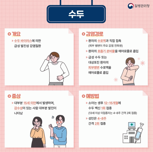 또한 어린이집과 유치원 등 보육시설에서는 손 씻기 교육과 물품 소독 등 위생 관리를 강화하고 수두에 감염된 영유아는 증상이 회복될 때까지 등원을 자제하도록 지도해야 한다.