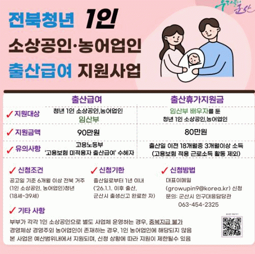군산시 관계자는 “이번 사업은 청년 1인 소상공인과 농어업인의 삶에 실질적인 변화를 가져올 정책”이라며 “출산과 경영을 병행해야 하는 청년들에게 실질적인 도움이 되길 바란다”고 말했다.