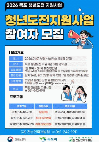목포시 관계자는 “청년도전 지원사업은 단순한 취업 알선이 아닌, 청년들이 다시 도전할 수 있는 힘을 키워주는 사업”이라며 “구직을 단념했던 청년들이 지역에서 안정적으로 정착할 수 있도록 적극 지원하겠다”고 말했다.