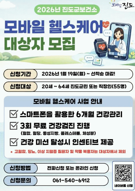 진도군 관계자는 “군민 스스로 건강 상태를 인식하고 일상생활 속에서 건강관리를 실천할 수 있도록 맞춤형 건강관리 서비스를 제공함으로써, 군민의 자가 건강관리 역량을 강화하고 만성질환 예방과 전반적인 건강 수준을 향상하기 위해 최선을 다하겠다.”라고 말했다.