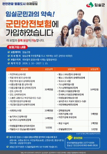 군에 따르면 임실군은 군민의 안전 사각지대를 최소화 하기위해 군민안전보험의 보장항목을 확대하고, 이달 16일부터 2027년 1월 15일까지 군민안전보험을 운영하고 있다.