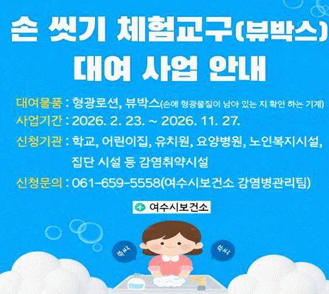 한편, 손 씻기 체험교구 대여 신청 및 자세한 사항은 여수시보건소 감염병관리팀으로 문의하면 된다.