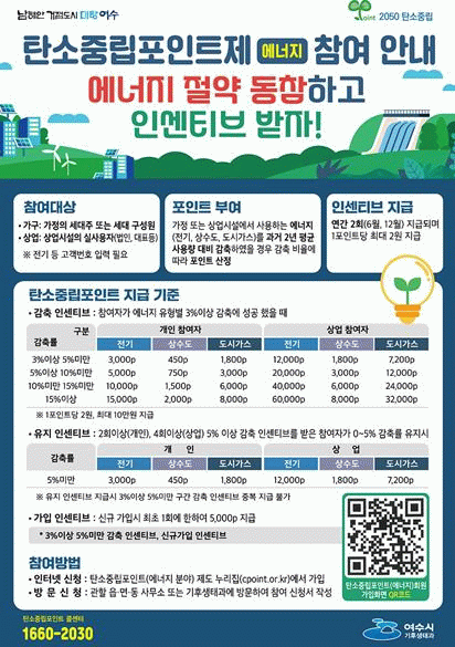 지난해 여수시에서는 총 1만 6,543가구가 탄소중립포인트제에 참여해 약 2억 6천7백만 원의 인센티브를 지급받았으며 3,710tCO2eq(이산화탄소환산톤)의 이산화탄소를 감축하는 성과를 거뒀다.