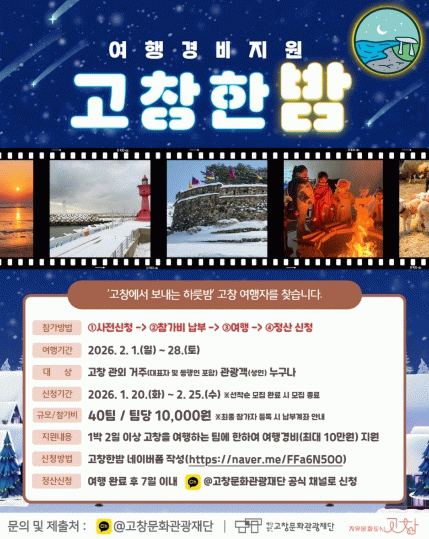 2026년 ‘고창한밤’은 2월부터 본격 운영되며, 운영 안정화를 위해 사전 모집제로 진행된다. 사전 모집 신청 기간은 1월20일부터 2월25일까지로, 총 40팀을 선착순으로 모집하며 모집 인원 충원 시 조기 마감된다.