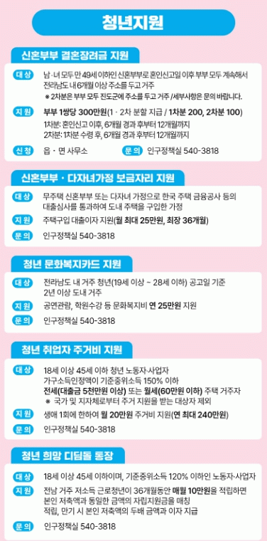 이 밖에도 ▲청년 취업자 전세·월세 지원(월 20만 원, 최대 1년) ▲신혼부부·다자녀 가정 보금자리 지원(주택 구입 대출이자 3년간 지원) ▲청년 희망 디딤돌 통장 사업(월 10만 원 매칭 적립, 3년) ▲청년 문화복지카드 지원(연 25만 원) ▲청년 생활공구 무료 대여 사업 등을 통해 주거와 자산 형성, 생활 편의를 종합적으로 지원하고 있다.