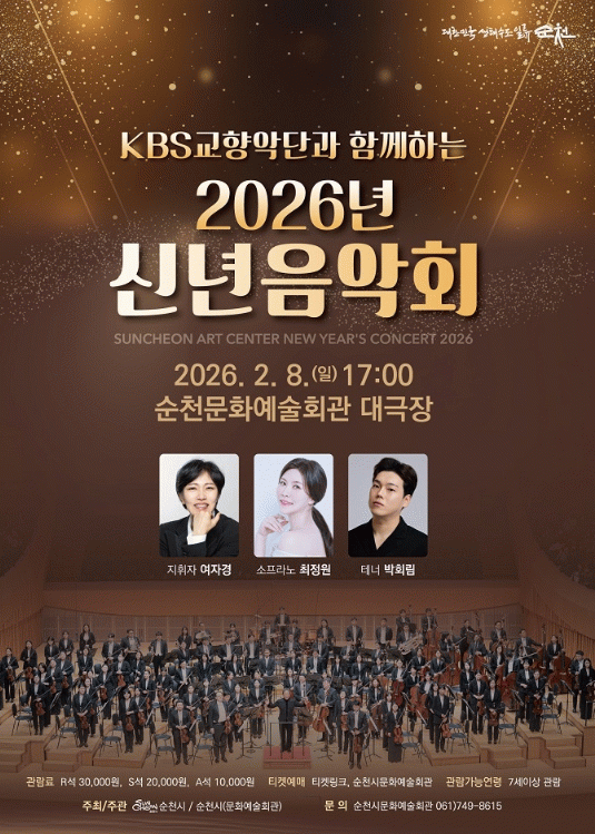 순천문화예술회관 관계자는 “희망찬 새해를 응원하며 수준 높은 클래식 음악의 향연으로 시민들에게 희망과 감동을 선사할 공연에 많은 관심과 참석을 부탁드린다”고 말했다.