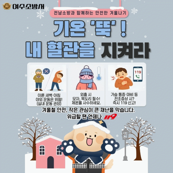 여수소방서는 시민들이 쉽게 이해하고 실천할 수 있도록 카드뉴스를 제작해 배포하며, 이른 새벽과 아침 시간대의 무리한 야외활동을 자제할 것을 당부했다. 또한 외출 시에는 모자와 목도리를 착용해 체온 유지를 철저히 하고, 가슴 통증이나 마비 증상 등 전조 증상이 나타날 경우 즉시 119에 신고해 신속한 응급처치를 받을 것을 강조했다.