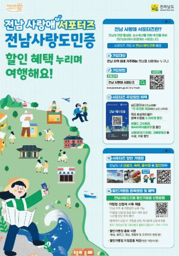 현재 전남 사랑애 서포터즈는 64만 명을 넘어섰으며, 관광, 숙박, 음식점 등 940여 제휴 할인가맹점 할인과 남도장터 쿠폰, JN투어 숙박 할인 등 다양한 혜택을 제공하고 있다.